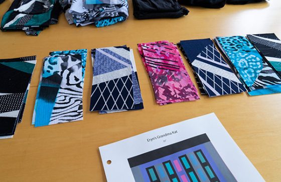 Kelley had done some helpful thinking around grouping Kat’s clothing for each of the quilts, and she had all of the garments bagged separately when she brought them over to my studio. As is often the case with a “family” of quilts, we chose to make all six quilts with the same quilt pattern, knowing that the individuality of each one would emerge with the different combinations of fabric groupings.
