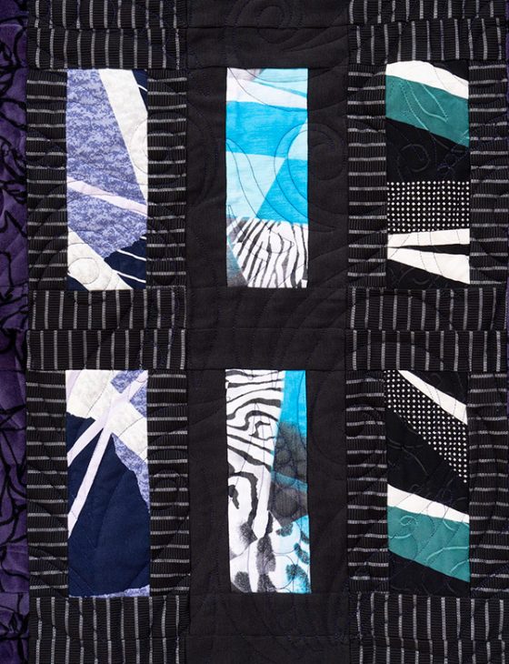 Next came Eryn’s quilt, again with a lot of black, highlighted by pops of blues, greens, and white.